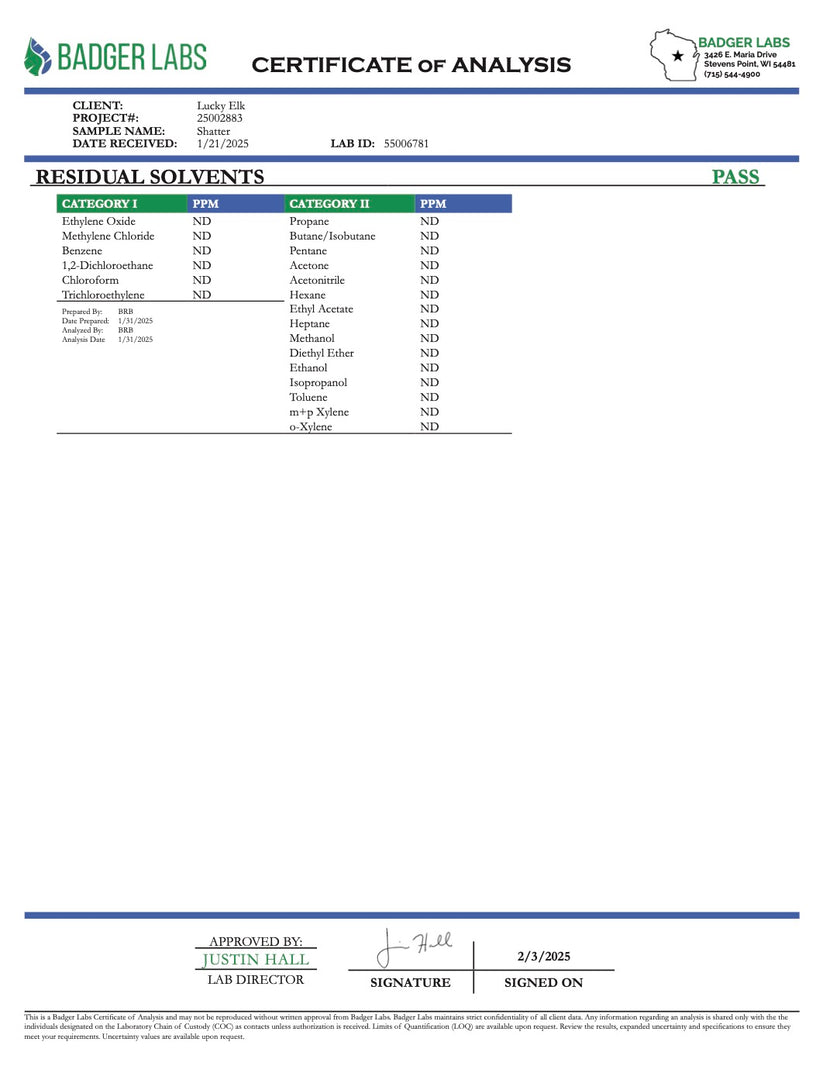 Crisp, clean, and highly potent—THCa Shatter delivers a pure, glass-like concentrate with sharp flavors and strong effects. Made from organically grown cannabis, this extract offers the classic pull-and-snap consistency. With its stable, translucent structure, shatter preserves the essential cannabinoids and terpenes of each strain, letting the bold aromas and flavors shine. Designed for dabbing, THCa Shatter provides a clean, powerful vapor with smooth, consistent effects in every hit.